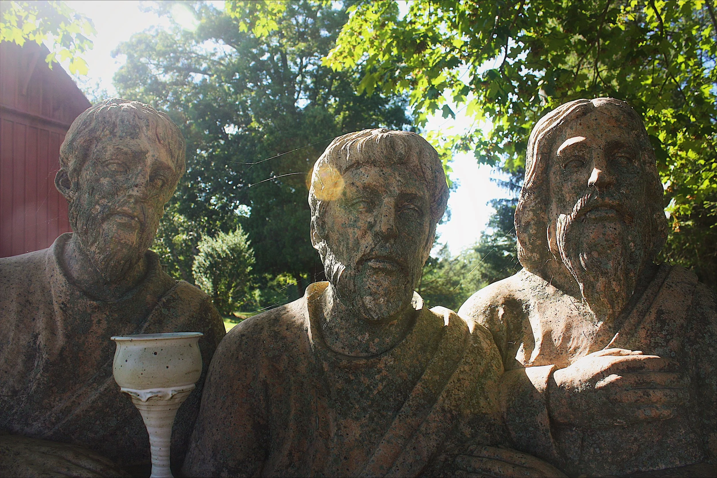 As I strolled through a familiar area of my hometown, I took an extra moment to observe a few sculptures beside the graveyard chapel of my local church, Our Lady of Czestochowa. These three have been staring off into space for many, many years, not even looking at one another or taking a sip from the glass one holds. All they see are the passers-by, and now my camera lens. Too bad they weren’t made to smile.